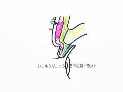 まず眉毛の下ギリギリで切開し、シミュレーションで引き上げた量と同じ幅で皮膚を切除します。