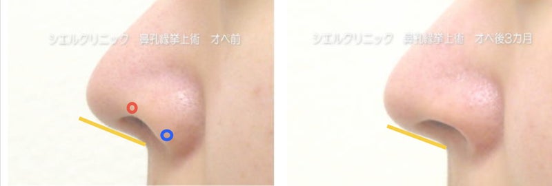 術後明らかに鼻柱の角度が下がっています。